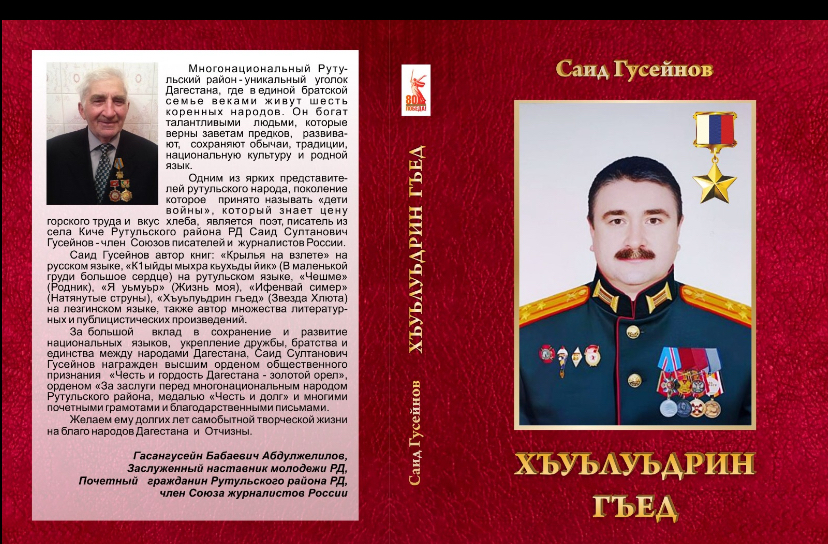 Отметим, что поэт и писатель Саид Гусейнов России, несмотря на свой 90-летний возраст, посвятил свою книгу «Хъуьлуьдрин гъед»(Звезда Хлюта) на лезгинском языке в знак увековечивания светлой памяти Героя Российской Федерации Магомеджанова Магомедали Камильевича, (01.01.1967г.- 14.02.2024г.), героически погибшего гвардии полковника при выполнении боевой задачи по защите суверенитета России в специальной военной операции (СВО), удостоенного звания Героя Российской Федерации (посмертно), мужественного офицера Российской армии, беззаветно преданного своей Родине, уроженца лезгинского села Хлют Рутульского района РД и в благодарность нашим российским военнослужащим, всем павшим и живым, кто с честью сегодня выполняет свой воинский и человеческий долг перед Отечеством.